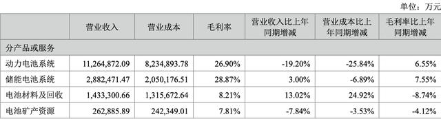 從目前寧德時代業(yè)務情況來看,其主營業(yè)務包括動力電池系統(tǒng)、儲能電池系統(tǒng)、電池材料及回收、電池礦產(chǎn)資源。今年上半年,寧德時代動力電池系統(tǒng)營收為1126億元,同比下滑19%,占總營收的比例為67%。值得注意的是,雖然寧德時代上半年動力電池系統(tǒng)營業(yè)成本同比下降25.84%,動力電池系統(tǒng)營收下降,但其動力電池系統(tǒng)毛利率同比增長6.55%至26.9%。