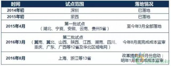 原定2017年開展的14個(gè)省級(jí)電網(wǎng)輸配電價(jià)改革提前至2016年9月啟動(dòng),基本實(shí)現(xiàn)省級(jí)電網(wǎng)的全覆蓋;計(jì)劃于2017年1月底完成成本監(jiān)審工作。