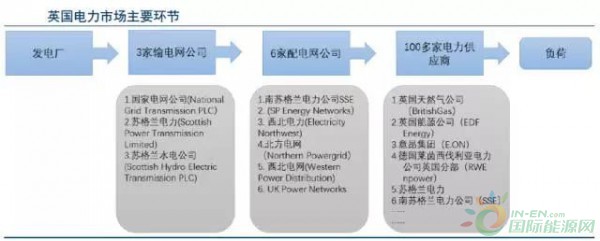 整個(gè)英國(guó)由3家輸電網(wǎng)公司負(fù)責(zé)區(qū)域性輸電網(wǎng)絡(luò)。在配電網(wǎng)層面,英國(guó)被劃分為14個(gè)區(qū)域并由6大配電網(wǎng)公司(DNOs)運(yùn)營(yíng)。配電公司作為獨(dú)立于輸電和售電環(huán)節(jié)的中間人,通過(guò)運(yùn)作其擁有的配電網(wǎng)絡(luò)將輸電網(wǎng)傳輸?shù)碾娏Ψ峙浣o民用和工商業(yè)用戶。但是配電公司并不參與售電的環(huán)節(jié)。與發(fā)電、輸電和配電公司不同的是,英國(guó)電力供應(yīng)商被定義為支付配電網(wǎng)絡(luò)費(fèi)用并從電力批發(fā)市場(chǎng)中購(gòu)買電力,再以一定價(jià)格出售給自己顧客的商業(yè)實(shí)體。