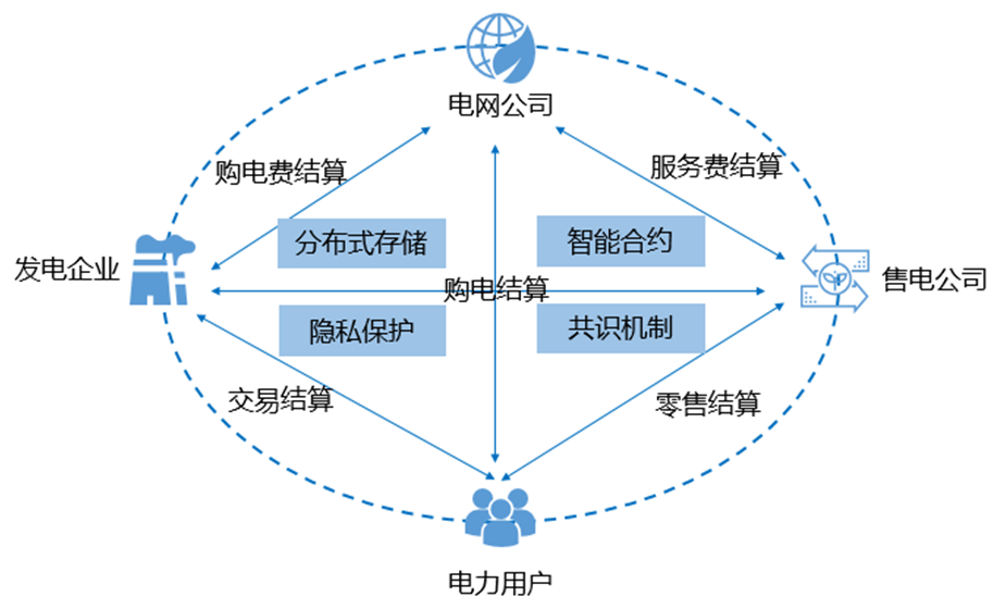 基于區(qū)塊鏈的電費結(jié)算方案,通過區(qū)塊鏈智能合約機制、分布式存儲技術將電力市場的交易主體(發(fā)電企業(yè)、售電公司、電網(wǎng)公司、電力用戶)“鏈”接起來,用數(shù)字化編碼將清算結(jié)算規(guī)則寫入?yún)^(qū)塊鏈,進一步提高相關交易的公開透明程度,使購電、零售和服務等結(jié)算過程更可信、更可控,形成以滿足用戶為代表的市場主體個性化結(jié)算服務模式。