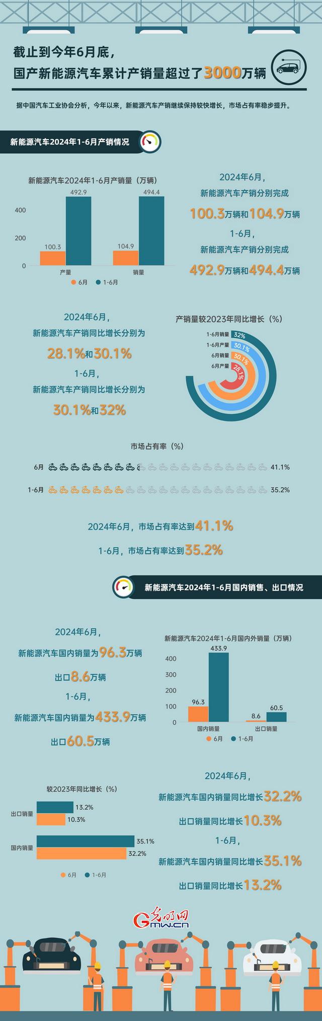據(jù)中國(guó)汽車工業(yè)協(xié)會(huì)分析,今年以來,新能源汽車產(chǎn)銷繼續(xù)保持較快增長(zhǎng),市場(chǎng)占有率穩(wěn)步提升。根據(jù)協(xié)會(huì)統(tǒng)計(jì),截止到今年6月底,國(guó)產(chǎn)新能源汽車?yán)塾?jì)產(chǎn)銷量超過了3000萬輛。