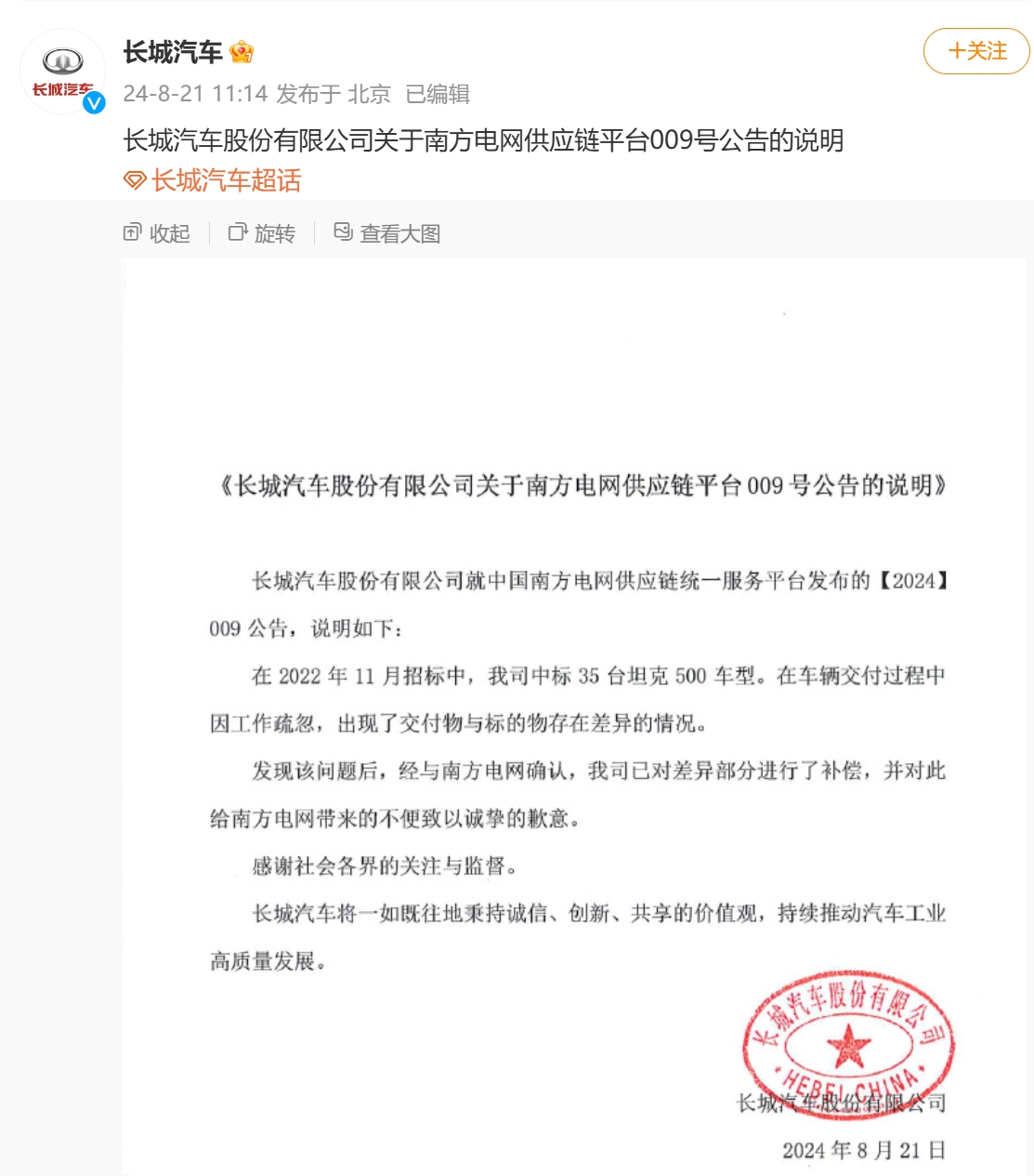8月21日,長(zhǎng)城汽車發(fā)布關(guān)于南方電網(wǎng)供應(yīng)鏈平臺(tái)009號(hào)公告的說(shuō)明。長(zhǎng)城汽車稱,在2022年11月招標(biāo)中,長(zhǎng)城汽車中標(biāo)35臺(tái)坦克500車型。在車輛交付過(guò)程中因工作疏忽,出現(xiàn)了交付物與標(biāo)的物存在差異的情況。發(fā)現(xiàn)該問(wèn)題后,經(jīng)與南方電網(wǎng)確認(rèn),長(zhǎng)城汽車已對(duì)差異部分進(jìn)行了補(bǔ)償,并對(duì)此給南方電網(wǎng)帶來(lái)的不便致以誠(chéng)摯的歉意。此前,根據(jù)南方電網(wǎng)發(fā)布的供應(yīng)商處理公告,長(zhǎng)城汽車被南方電網(wǎng)列為“不接受投標(biāo)”的供應(yīng)商。