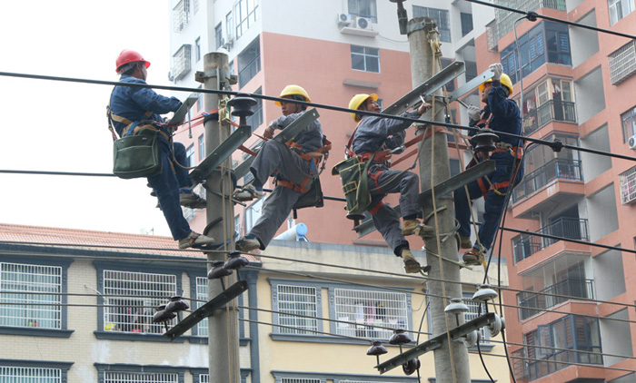 日前,在湖南省永州市寧遠縣城區(qū)舜帝北路段,筆者看到,電力工人們正在忙碌地架設(shè)10KV 逍水線延伸線。