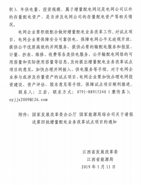 江西省發(fā)改委、江西省能源局日前聯(lián)合發(fā)布了《關(guān)于報(bào)送第四批增量配電業(yè)務(wù)改革試點(diǎn)項(xiàng)目的通知》,要求各地要結(jié)合工作實(shí)際情況,認(rèn)真總結(jié)前三批試點(diǎn)經(jīng)驗(yàn),按照國家相關(guān)要求盡快篩選符合條件的第四批試點(diǎn)項(xiàng)目,試點(diǎn)項(xiàng)目應(yīng)符合省級(jí)電網(wǎng)規(guī)劃。強(qiáng)調(diào)電網(wǎng)企業(yè)要積極配合做好增量配電業(yè)務(wù)改革工作。對(duì)試點(diǎn)項(xiàng)目,電網(wǎng)企業(yè)要保障安全可靠供電,保障電網(wǎng)公平無歧視開放, 提供公平優(yōu)質(zhì)高效的并網(wǎng)服務(wù),提供必要的輸配電服務(wù)和報(bào)裝、 計(jì)量、抄表、維修、收費(fèi)等各類供電服務(wù),公開輸配電網(wǎng)絡(luò)的可 用容量和實(shí)際使用容量等信息,及時(shí)提出增量配電業(yè)務(wù)改革試點(diǎn)項(xiàng)目的意見,加快辦理并網(wǎng)接入、供電服務(wù)等手續(xù)。