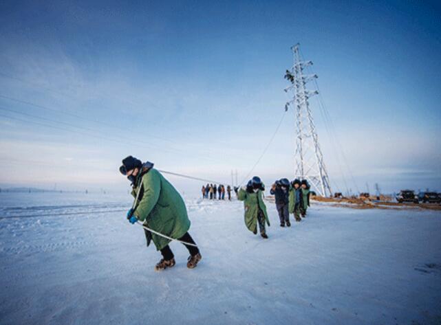 11月25日,錫林郭勒盟蘇尼右旗滴水成冰,20多名身著軍大衣、頭戴棉質(zhì)安全帽的工人在白雪皚皚的草原深處喊著號子、齊力拉著導引繩,拖拽著身后近30米高的鐵塔。鐵塔上站著的幾個工人,正吃力地加固塔上的導線。不遠處挖掘機、轉(zhuǎn)載機隆隆作響,一片如火如荼的繁忙景象。