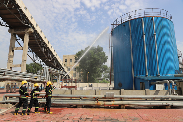 該廠值班員發(fā)現(xiàn)火情,立即撥打火警電話報(bào)火警,通知消防泵房值班員,立即啟動(dòng)泡沫消防系統(tǒng),并立即匯報(bào)值長(zhǎng)和分場(chǎng)領(lǐng)導(dǎo)。值長(zhǎng)接到火情報(bào)告后,立即向廠部匯報(bào),廠部聽(tīng)取匯報(bào)后立即下達(dá)啟動(dòng)《燃油罐區(qū)火災(zāi)應(yīng)急預(yù)案》命令,值長(zhǎng)迅速聯(lián)系各應(yīng)急組人員立即趕赴事故現(xiàn)場(chǎng)進(jìn)行應(yīng)急救援。演練中燃運(yùn)分場(chǎng)組織人員撲救初級(jí)火災(zāi),并使用地下消防栓對(duì)罐體進(jìn)行冷卻,保衛(wèi)部消防隊(duì)接到報(bào)警后立即出動(dòng)消防車進(jìn)行滅火,同時(shí)聯(lián)系臨近化肥廠消防隊(duì)進(jìn)行支援應(yīng)急聯(lián)動(dòng),各應(yīng)急組迅速到達(dá)現(xiàn)場(chǎng),緊張有序開(kāi)展應(yīng)急救援,經(jīng)過(guò)協(xié)同作戰(zhàn),火情得到控制,無(wú)人員受傷,消防隊(duì)員清理現(xiàn)場(chǎng)防止復(fù)燃,至此演練結(jié)束。