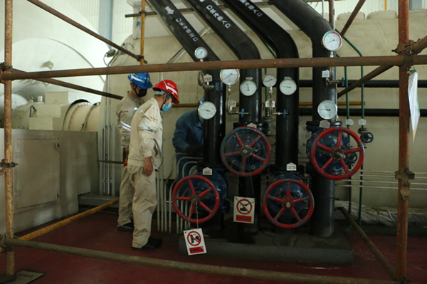攻堅(jiān)克難,保機(jī)組穩(wěn)定運(yùn)行。大鵬之動(dòng),非一羽之輕也;騏驥之速,非一足之力也。盛夏的廠房?jī)?nèi)異常悶熱,機(jī)組設(shè)備發(fā)出來的熱量讓人喘不過氣來,就在這種條件下,該廠干部職工為了快速消除缺陷,不懼困難,連續(xù)奮戰(zhàn)在現(xiàn)場(chǎng)??偣こ處煻诖蠹易⒁獍踩?,輪換休息,防止中暑,并協(xié)調(diào)解決工器具及材料,查看作業(yè)環(huán)境,檢查安全措施;設(shè)備部積極與哈爾濱電機(jī)廠取得聯(lián)系,請(qǐng)專業(yè)人員入廠探討解決方法,同時(shí)編制安全技術(shù)組織措施方案,解決設(shè)備作業(yè)過程中遇到的技術(shù)性問題,對(duì)設(shè)備作業(yè)過程中出現(xiàn)的質(zhì)量問題提出整改意見;安監(jiān)部強(qiáng)化監(jiān)督,從兩票控制措施執(zhí)行、腳手架及現(xiàn)場(chǎng)防爆行燈漏電保護(hù)器的使用情況到確認(rèn)施工現(xiàn)場(chǎng)氫氣含量等無死角的全程檢查盯守,為消缺工作保駕護(hù)航;發(fā)電部運(yùn)行人員全力配合,嚴(yán)格按照工作票所列危險(xiǎn)點(diǎn)布置安全措施,開關(guān)閥門,在檢修期間密切監(jiān)視發(fā)電機(jī)風(fēng)溫,發(fā)現(xiàn)問題及時(shí)對(duì)參數(shù)進(jìn)行調(diào)整,在保證機(jī)組安全運(yùn)行的基礎(chǔ)上,為消缺工作創(chuàng)造便利條件;電氣車間電機(jī)班人員分解氫冷器冷卻水出、入口法蘭短接及彎頭,在氫冷器冷卻水入口法蘭處加裝堵板,把配制好的藥液從氫冷器冷卻水出口彎頭處注滿氫冷器。工作中大家分工明確,忙而不亂,盡管現(xiàn)場(chǎng)氣溫高,卻沒有阻擋大家的干勁。
