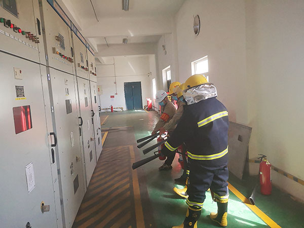 此次演練場景設(shè)置為模擬SVG連接變壓器341高壓開關(guān)柜著火,共場景11個。在總指揮交代運行方式、應(yīng)急組組長進行安全交底后,隨著生產(chǎn)樓辦公區(qū)域傳出刺耳的火警警報聲,演練正式開始。煙感報警裝置發(fā)現(xiàn)火情,應(yīng)急組長立即派人就地檢查發(fā)現(xiàn)341高壓開關(guān)柜下部冒出濃煙,判斷為開關(guān)出線電纜接頭放炮引起,隨即組織現(xiàn)場滅火、匯報集控中心和調(diào)度、撥打火警電話、啟動防火應(yīng)急響應(yīng)等一系列應(yīng)急措施迅速展開,全體參演人員穿上戰(zhàn)斗服,手提二氧化碳滅火器,迅速向開關(guān)柜內(nèi)噴入滅火劑,經(jīng)過數(shù)分鐘的撲救,在消防隊到來前將火撲滅,應(yīng)急組配合消防隊人員檢查現(xiàn)場是否有復(fù)燃可能,總指揮宣布解除應(yīng)急響應(yīng),演練結(jié)束。
