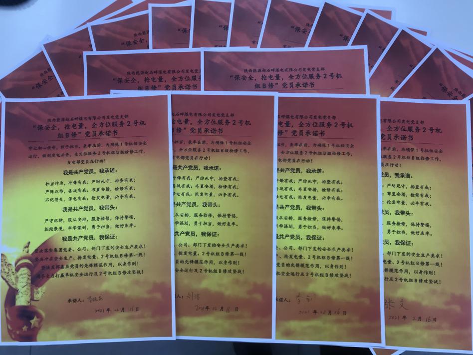 他們保證:堅決落實(shí)集團(tuán)黨委、公司、部門下發(fā)的安全生產(chǎn)要求!堅決沖在安全生產(chǎn)、搶發(fā)電量、2號機(jī)組B修第一線!堅決發(fā)揮基層黨員的先鋒模范作用,以身作則!竭盡全力打贏單機(jī)安全運(yùn)行及2號機(jī)組B修攻堅戰(zhàn)!