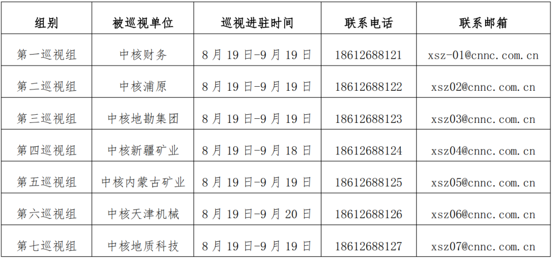 根據(jù)中核集團黨組巡視工作統(tǒng)一部署,8月19日,黨組第一至第七巡視組分別進駐中核財務(wù)有限責任公司、上海中核浦原有限公司、中核地質(zhì)勘查集團有限公司、中核新疆礦業(yè)有限公司、中核內(nèi)蒙古礦業(yè)有限公司、中核(天津)機械有限公司、中核地質(zhì)科技有限公司等7家單位并召開巡視工作動員會。