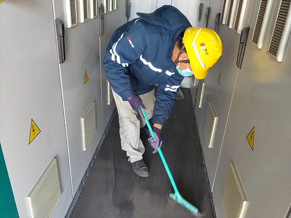 該電站毗鄰當?shù)貫跆m布和沙漠,廠址周邊植被少,冬季多為大風天氣,為防止光伏板被風吹落,該公司運維人員對光伏組件基礎進行細致檢查,對相對薄弱的區(qū)域進行埋石填土加固,對組件支架銹蝕的螺栓及時進行更換,對傾斜的立柱進行校正固定;站內(nèi)防凍措施已提前落實,但隨著氣溫的降低,相關防護需要每日一檢,該公司運維人員對生活水井的保暖措施進行再加固,在井蓋上方罩住多層保溫被,隔離井口積水,為閥門制作防護罩,保證生活用水正常供應,同時對電暖氣和空調(diào)開展全面檢查,對用電負荷電流進行鉗測,避免過負荷故障和火災事故;在主設備風沙防治上,這群年輕人狠下功夫,他們每天在太陽下山前開好工作票,在太陽下山后做好安全措施,集中清掃逆變器室和箱變室塵土和更換濾網(wǎng),每日清掃一組,一個月一輪回,解決逆變器及箱變積沉較多、散熱不良問題;在送出線路檢查上,他們每日對17條站內(nèi)線路和1條送出線路進行徒步巡線,細致檢查桿塔金具、導線、地線固定情況,并利用夜間停電機會及時消除異常隱患,保證涉網(wǎng)設備正常運行。