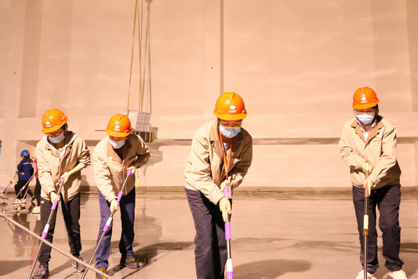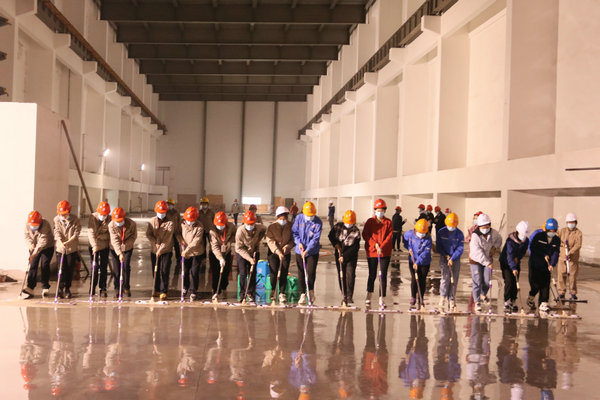 在到達位于汽機房17米平臺的GIS室后,女職工明確分工,協(xié)同配合,裝水、噴水、清掃、沖水、拖地……分區(qū)域、分小組地對GIS室地面進行清潔。當(dāng)大家看著地面從塵土漫漫逐漸變成干凈整潔的地面,干凈的面龐已是塵土夾雜著汗水,臉上的笑容依舊如初,勞動的成就感,為工程建設(shè)作出力所能及貢獻的自豪感充溢著大家的內(nèi)心。經(jīng)過兩個多小時的勞動,順利完成了600平方米GIS室地面的清潔。