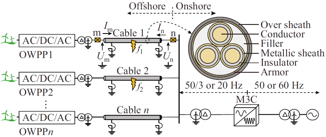 圖1給出了海上風(fēng)電低頻輸電系統(tǒng)拓?fù)?,海纜需匯集來(lái)自于風(fēng)電場(chǎng)的電能,并經(jīng)模塊化多電平矩陣換流器(modular multilevel matrix converter,M3C)實(shí)現(xiàn)頻率轉(zhuǎn)換,從而在M3C低頻側(cè)構(gòu)成了100%電力電子源場(chǎng)景。相較于同步機(jī)系統(tǒng)在負(fù)序網(wǎng)絡(luò)中源側(cè)只體現(xiàn)阻抗特性,低頻輸電系統(tǒng)負(fù)序網(wǎng)絡(luò)中線路兩側(cè)均可體現(xiàn)為電源特性。根據(jù)單相接地故障和兩相相間故障復(fù)合序網(wǎng)圖,故障支路電流可由負(fù)序電流唯一確定,當(dāng)M3C和海上風(fēng)電場(chǎng)網(wǎng)側(cè)變流器(grid-side converter, GSC)抑制負(fù)序電流時(shí),盡管故障點(diǎn)處存在負(fù)序電壓源,但兩側(cè)換流器均會(huì)生成幅值相位相同的電壓源,以抵消系統(tǒng)中的負(fù)序電流,因此系統(tǒng)故障電流仍保持對(duì)稱,使得故障支路的穩(wěn)態(tài)電流為0。上述分析表明,雖然風(fēng)電場(chǎng)升壓變壓器和M3C低頻側(cè)隔離變壓器網(wǎng)側(cè)中性點(diǎn)均采取直接接地方式,但低頻輸電系統(tǒng)在特定故障控制策略下呈現(xiàn)出類似于中性點(diǎn)非直接接地系統(tǒng)的故障特征。