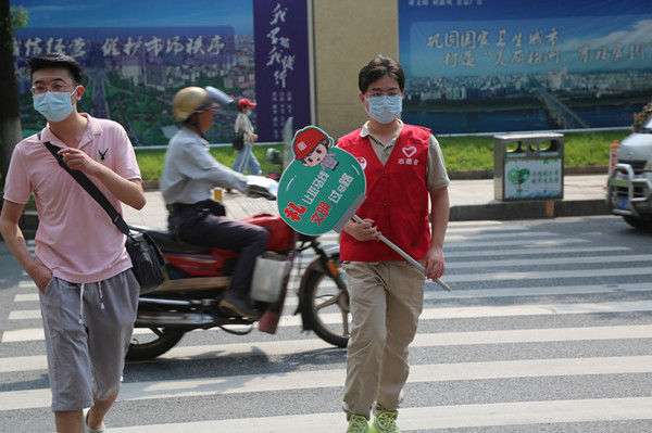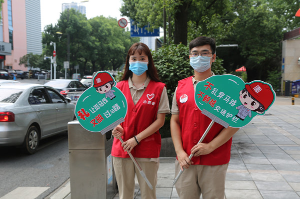 “不亂穿馬路,不翻越交通護欄。”“文明開車,不得車窗拋物。”“紅燈停、綠燈行,黃燈亮了等一等!”“禮讓斑馬線,文明過馬路。”志愿者們對過往行人不文明行為及時進行勸導,為株洲文明城市建設(shè)貢獻力量。