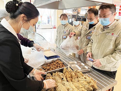 經過大廚們精心烹制的色、香、味集于一身的各種熟食,深受職工的喜愛,供不應求,剛一出鍋就被搶購一空。“今年的魚炸的特別香,昨天買回去兩個孩子都搶著吃,今天打算再多買幾條”“今年過年不回家了,和爸媽通了視頻電話,他們看到單位條件這么好,心里很放心”“公司為我們準備了物美價廉的‘年貨’,雖然今年堅守崗位不回家過年,卻讓我們真真切切感受到了家的溫暖,真得很暖心”大伙兒拎著買到的年貨紛紛說道。