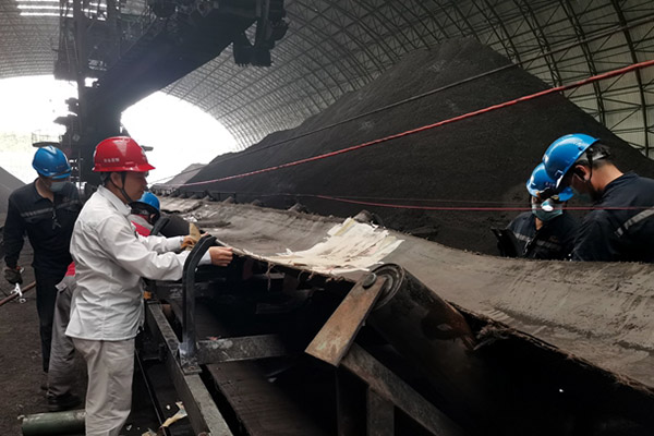 在煤場,該公司燃料檢修人員按照皮帶粘接工藝規(guī)范要求,正在進行一期3號皮帶接頭膠接,管理人員到崗到位,嚴(yán)把質(zhì)量關(guān)。