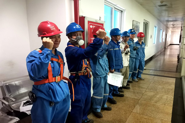 集控室走廊,該公司檢修部和拓奇項目部鍋爐檢修人員用堅守撐起最燦爛的笑容。他們嚴(yán)陣以待,待壓力到位保壓后進行系統(tǒng)全面檢查工作,為6號鍋爐水壓試驗作好準(zhǔn)備。