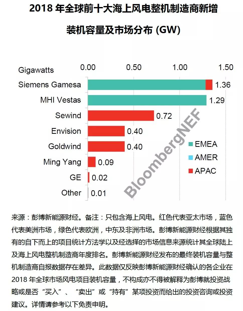 Siemens Gamesa2018年全球海上風(fēng)電新增裝機(jī)容量為1.36GW,市場(chǎng)份額達(dá)32%,繼續(xù)領(lǐng)跑全球海上風(fēng)電市場(chǎng)。