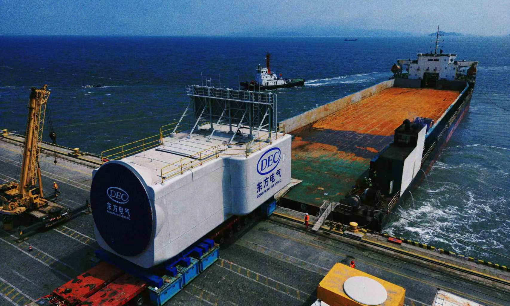 近日,由東方電氣集團研制的全球單機容量最大26兆瓦海上風電機組核心部件——153米全球最長葉片和超500噸全球最重機艙,安全抵達山東東營廣利港。