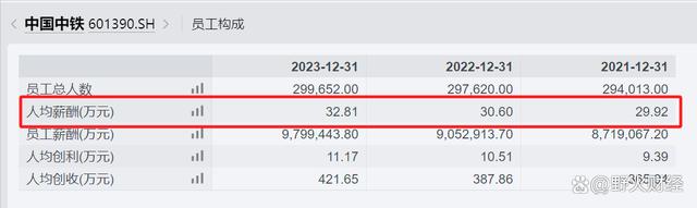 至去年末,中鐵股份的職工總數(shù)近30萬(wàn)人,去年人均創(chuàng)收422萬(wàn)元,人均創(chuàng)利11.2萬(wàn)元,人均薪酬則近33萬(wàn)元,比2022年增加2萬(wàn)多元,在建筑企業(yè)中居前。