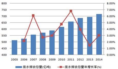 據(jù)統(tǒng)計(jì),目前全國(guó)地表水體中Ⅰ類、Ⅱ類、Ⅲ類、Ⅳ類、Ⅴ類和劣Ⅴ類水質(zhì)占比分別為31%、30%、21%、6%、9%和3%,其中Ⅳ類及Ⅳ類以下水質(zhì)水體占比近4成,水質(zhì)污染問(wèn)題嚴(yán)重。每年水質(zhì)污染給人體健康、工業(yè)生產(chǎn)、農(nóng)業(yè)生產(chǎn)和漁業(yè)養(yǎng)殖等方面造成的經(jīng)濟(jì)損失約2400億。。2014年全國(guó)廢水排放總量約為716億噸,較2005年的514億噸增長(zhǎng)近4成,2005至2014十年間年復(fù)合增長(zhǎng)率為3.4%,保持逐年穩(wěn)步增長(zhǎng)。