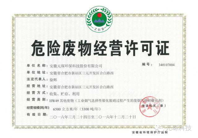 危廢轉(zhuǎn)運(yùn):安徽元琛環(huán)保是全國(guó)首家同時(shí)具有脫硝催化劑生產(chǎn)、再生及回收資質(zhì)的綜合性環(huán)保企業(yè),具有HW49廢煙氣脫硝催化劑 (《國(guó)家危廢名錄》2008版), HW50廢煙氣脫硝催化劑 (《國(guó)家危險(xiǎn)廢物名錄》2016版)危廢經(jīng)營(yíng)許可證。
