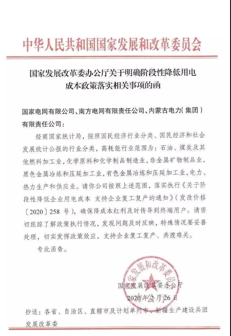 近日,國家發(fā)展改革委印發(fā)《關于明確階段性降低用電成本政策落實相關事項的函》,函件中進一步明確高耗能行業(yè)范圍為:石油、煤炭及其他燃料加工業(yè),化學原料和化學制品制造業(yè),非金屬礦物制品業(yè),黑色金屬冶煉和壓延加工業(yè),有色金屬冶煉和壓延加工業(yè),電力、熱力生產和供應業(yè)。除以上行業(yè)外的工業(yè)用戶及全部商業(yè)用戶可享受電價95折優(yōu)惠。