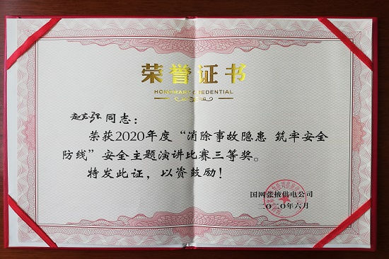6月18日,該公司新入司大學(xué)生趙志強(qiáng)參加國網(wǎng)張掖供電公司安全生產(chǎn)月演講比賽,公司《從零開始 向零奮斗》榮獲演講比賽三等獎。
