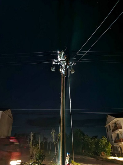 事故發(fā)生后,龔坊供電所所長楊程立即組織人員第一時間趕赴現(xiàn)場,經(jīng)現(xiàn)場查勘后制定搶修方案,在確保人身安全的前提下,連夜開展搶修工作。在搶修現(xiàn)場,做好安全措施后,樂安縣供電公司龔坊供電所10余名員工協(xié)同合作,對損毀的斷桿、導(dǎo)線、橫擔進行清理,重新立桿、安裝新的拉線、T接導(dǎo)線……搶修工作有條不紊的進行。