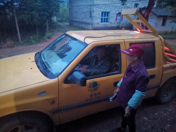 “太好了,你們來了,這下晚上可以不用摸黑了……”18時(shí)55分,經(jīng)過25分鐘的車程,陳文清班長(zhǎng)和班員到達(dá)陳家蕪頭村,陳德文和老伴正打 著手電筒,看到供電搶修車的到來,很是激動(dòng)。