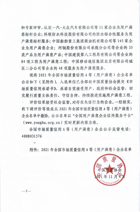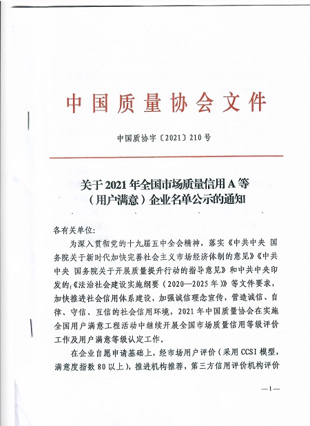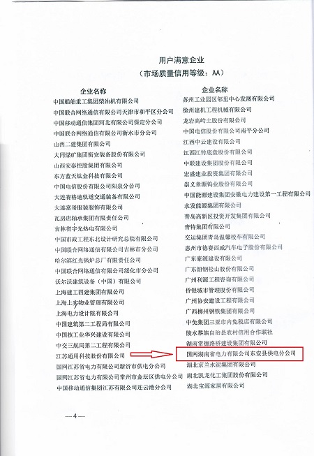 中國(guó)電力網(wǎng)訊 2021年11月18日,中國(guó)質(zhì)量協(xié)會(huì)發(fā)布了關(guān)于2021年全國(guó)市場(chǎng)質(zhì)量信用A等(用戶滿意)企業(yè)名單的通知(中國(guó)質(zhì)協(xié)字【2021】210號(hào)文)。經(jīng)過自愿申請(qǐng)、資料初審、第三方信用評(píng)價(jià)機(jī)構(gòu)評(píng)價(jià)和專家評(píng)審,國(guó)網(wǎng)湖南省東安縣供電分公司被評(píng)為用戶滿意企業(yè),市場(chǎng)質(zhì)量信用等級(jí)AA。