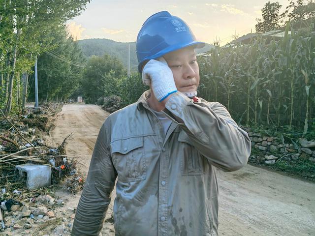 8月24日,在葫蘆島市綏中縣明水滿族鄉(xiāng)張福村,國網(wǎng)天津市電力公司應(yīng)急搶修隊(duì)員朱春雷搶修復(fù)電工作后擦拭臉上的汗珠。楊小童 攝