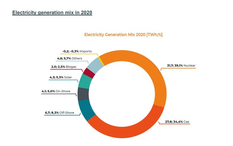除了擴(kuò)大可再生能源發(fā)電能力外,2020年電力標(biāo)志是核能發(fā)電量下降,滿(mǎn)足了比利時(shí)39.1%的電力需求,燃?xì)獍l(fā)電廠電量趨于穩(wěn)定,以及電力進(jìn)出口之間接近平衡。