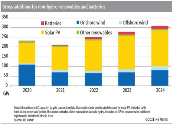 根據(jù)國際市場研究機構IHS Markit的白皮書,全球每年可再生能源發(fā)電容量增量將從2020年的200吉瓦增加到2022年的約250吉瓦,然后到2024年增加到300吉瓦以上。