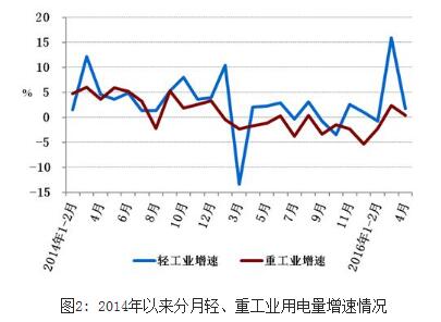 1-4月份,全國(guó)工業(yè)用電量12369億千瓦時(shí),同比增長(zhǎng)0.2%,增速比上年同期提高1.0個(gè)百分點(diǎn),占全社會(huì)用電量的比重為68.4%,對(duì)全社會(huì)用電量增長(zhǎng)的貢獻(xiàn)率為4.5%。其中,輕工業(yè)用電量2075億千瓦時(shí),同比增長(zhǎng)3.6%,增速比上年同期提高1.7個(gè)百分點(diǎn);重工業(yè)用電量為10295億千瓦時(shí),同比下降0.5%,增速比上年同期提高0.8個(gè)百分點(diǎn)。