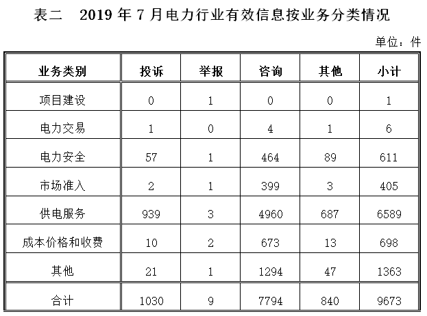 電力行業(yè)排在首位,有效信息數(shù)量為9673件,占全部有效信息的82.92%;其中受理的投訴舉報(bào)數(shù)量為1039件,占全部投訴舉報(bào)數(shù)量的96.38%。群眾反映的問(wèn)題主要集中在供電服務(wù)、電力安全、成本價(jià)格和收費(fèi)等方面。(2019年7月電力行業(yè)有效信息按業(yè)務(wù)分類(lèi)情況見(jiàn)表二)