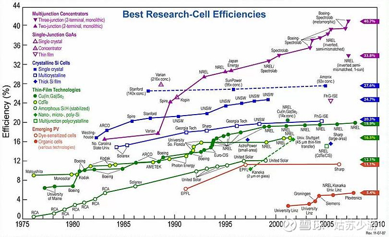 從十年前美國國家實驗室的技術(shù)演進圖來看,光伏的效率排序:異質(zhì)結(jié)(Multijunction)>單質(zhì)結(jié)(Single-junction)>多晶電池(Crystalline Si)>薄膜電池(Thin-film)。
