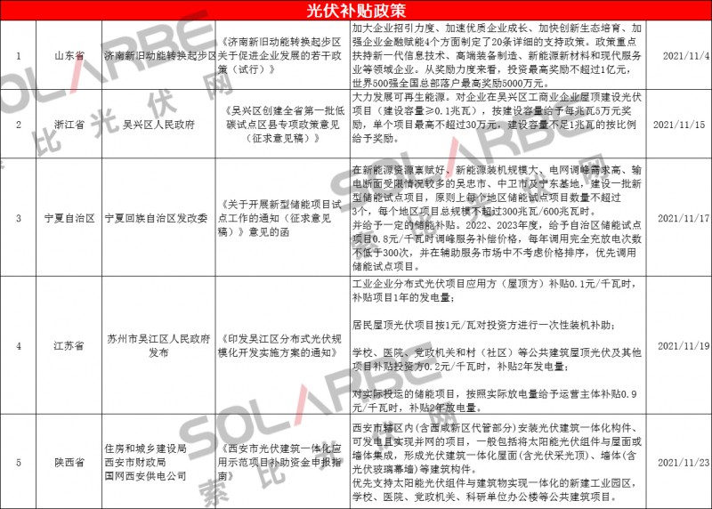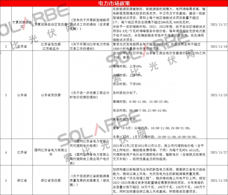 白駒過隙、時(shí)光荏苒,走過11月份,全年已接近尾聲。光伏政策在11月份集中爆發(fā),據(jù)索比光伏網(wǎng)不完全統(tǒng)計(jì),總共高達(dá)83條(國(guó)家21、地方62條)涉及24個(gè)省市地區(qū),包含國(guó)家政策、光伏項(xiàng)目、分布式光伏、光伏補(bǔ)貼、雙碳目標(biāo)、“十四五”規(guī)劃電力市場(chǎng)、整縣等其他相關(guān)政策。