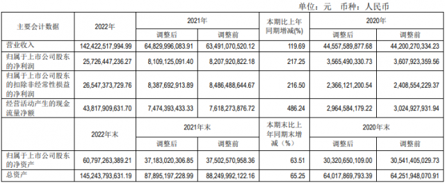 報(bào)告顯示,2022年,該公司實(shí)現(xiàn)營(yíng)收、歸母凈利潤(rùn)、扣非凈利潤(rùn)分別為1424.23億元、257.26億元、265.47億元,同比分別增長(zhǎng)119.69%、217.25%、216.50%。
