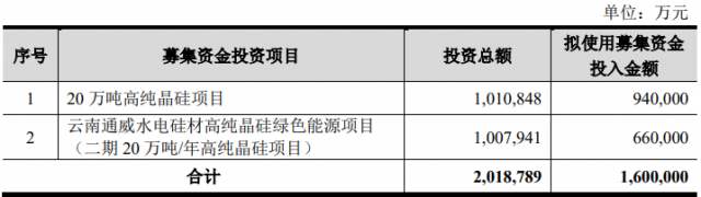 根據(jù)該方案,本次募資資金將用于兩大投資項(xiàng)目:一是20萬(wàn)噸高純晶硅項(xiàng)目,擬投入募資額94億元(總投資將達(dá)101.0848億元);二是云南通威水電硅材高純晶硅綠色能源項(xiàng)目(二期20萬(wàn)噸/年高純晶硅項(xiàng)目),擬投入募資額66億元(總投資將達(dá)100.7941億元)。