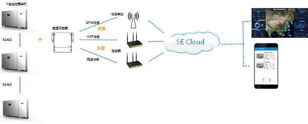 該方案中,每臺(tái)逆變器必須配置一個(gè)通訊配件(GPRS/Wifi/WLAN模塊),系統(tǒng)配置原理圖如下: