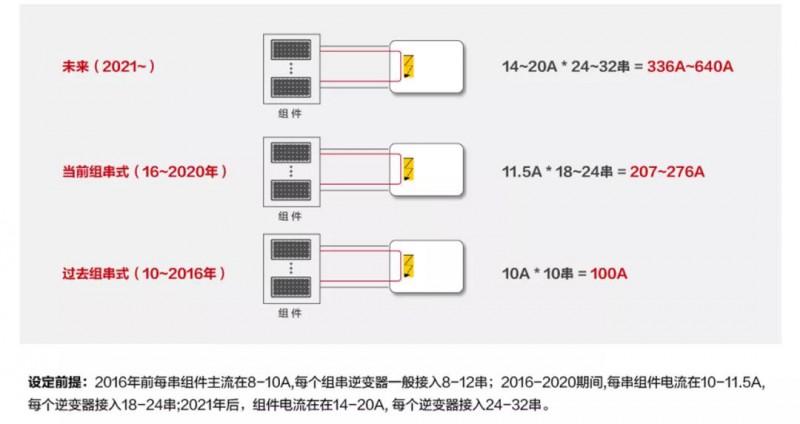 隨著硅片尺寸越來越大以及電池效率越來越高,組件電流不斷提高成為必然趨勢。我們看到,組件電流越來越大,逆變器功率或匯流箱對應(yīng)的組串?dāng)?shù)量也不斷增加。