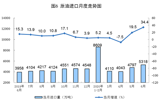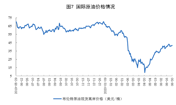原油進口快速增長,國際原油價格大幅回升。6月份,進口原油5318萬噸,同比增長34.4%。上半年,進口原油2.69億噸,同比增長9.9%,比一季度加快4.9個百分點。6月30日布倫特原油現貨離岸價格為41.64美元/桶,比5月29日的34.15美元/桶回升21.9%。