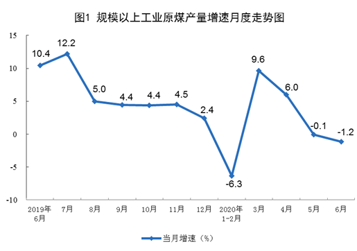 原煤生產小幅下降。6月份,生產原煤3.3億噸,同比下降1.2%,降幅比上月擴大1.1個百分點;日均產量1114萬噸,環(huán)比增加86萬噸。上半年,生產原煤18.1億噸,同比增長0.6%,一季度為下降0.5%。