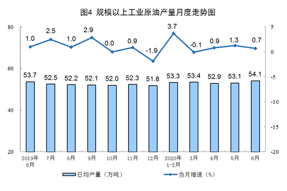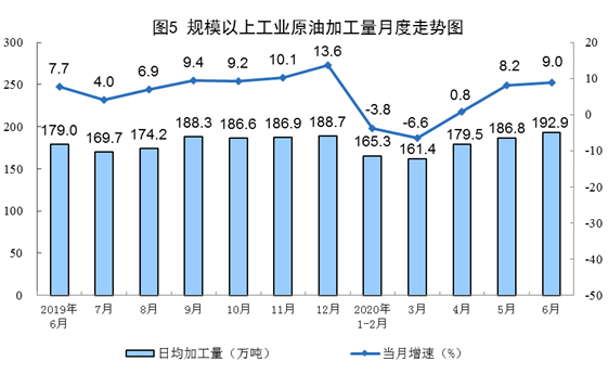 原油生產略有增長,加工量有所加快。6月份,生產原油1624萬噸,同比增長0.7%,增速比上月回落0.6個百分點;加工原油5787萬噸,增長9.0%,比上月加快0.8個百分點。上半年,生產原油9715萬噸,同比增長1.7%,比一季度放緩0.7個百分點;加工原油3.2億噸,同比增長0.6%,一季度為下降4.6%。