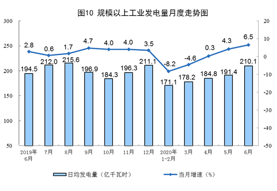 電力生產繼續(xù)加快。6月份,發(fā)電量6304億千瓦時,同比增長6.5%,增速比上月加快2.2個百分點;日均發(fā)電量210.1億千瓦時,環(huán)比增加18.7億千瓦時。上半年,發(fā)電量33645億千瓦時,同比下降1.4%,降幅比一季度收窄5.4個百分點。