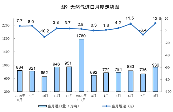 天然氣進口增速由負轉(zhuǎn)正。8月份,進口天然氣936萬噸,同比增長12.3%,上月為下降6.4%。1—8月份,進口天然氣6507萬噸,同比增長3.3%。