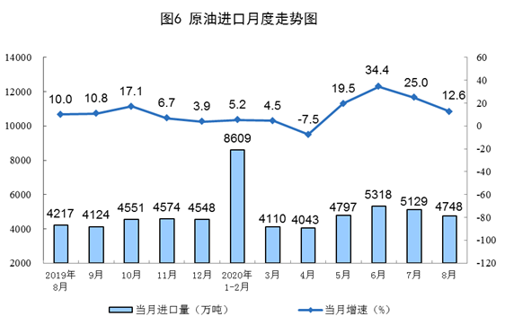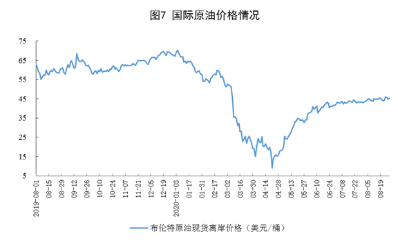 原油進口增速回落,國際原油價格小幅上漲。8月份,進口原油4748萬噸,同比增長12.6%,增速比上月回落12.4個百分點。1—8月份,進口原油3.7億噸,同比增長12.1%。8月28日布倫特原油現(xiàn)貨離岸價格為45.22美元/桶,比7月31日的43.13美元/桶上漲4.8%。