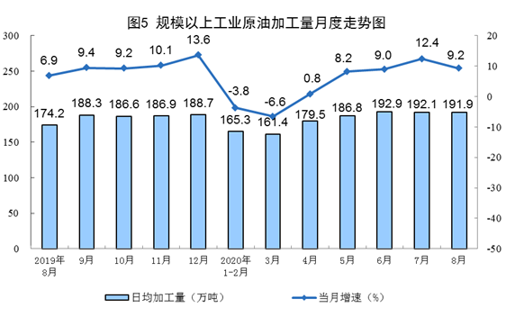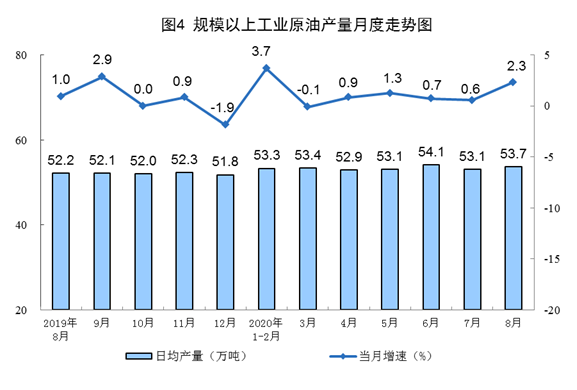 原油生產(chǎn)加快,加工有所放緩。8月份,生產(chǎn)原油1665萬噸,同比增長2.3%,增速比上月加快1.7個百分點;加工原油5947萬噸,增長9.2%,比上月放緩3.2個百分點。1—8月份,生產(chǎn)原油13015萬噸,同比增長1.5%;加工原油4.4億噸,同比增長3.2%。