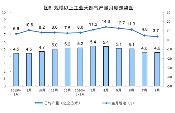 天然氣生產(chǎn)有所放緩。8月份,生產(chǎn)天然氣142億立方米,同比增長3.7%,增速比上月放緩1.1個百分點;日均產(chǎn)量4.6億立方米,與上月持平。1—8月份,生產(chǎn)天然氣1225億立方米,同比增長8.8%。